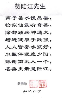 2015年潘志山主動寫一篇感想《我以親身實(shí)踐打破了冠心病、高血壓、糖尿病需終生服藥的神話》說:“堅(jiān)持按發(fā)明人陸?江先生倡導(dǎo)的用‘已饑方食’的方法合理膳食,我的健康狀況越來越好:糖尿病造成的視力下降有了明顯的恢復(fù),末梢神經(jīng)炎導(dǎo)致的指端潰爛現(xiàn)在完全痊愈,痔瘡自從飲用微小分子團(tuán)水半年后就再也沒有復(fù)發(fā)過,氣滯血瘀造成的嘴唇暗紫也漸漸變得紅潤,舌下靜脈黑紫消失,足背的動脈由以前的隱約感到跳動現(xiàn)在變得清晰有力。”[13]潘先生披露的訣竅,一是飲用微小分子團(tuán)水給脫水細(xì)胞補(bǔ)水,二是“已饑方食”養(yǎng)生智慧,患者都能做到。